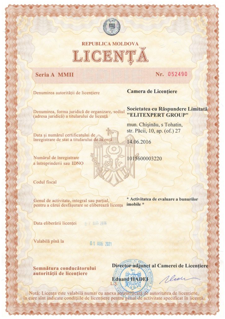 Compania de evaluări „ELITEXPERT” activează în domeniul respectiv din anul 2015. Compania noastră prestează servicii în domeniul evaluării și expertizei cât a bunurilor imobile și a bunurilor mobile.Expertiza și evaluarea se efectuaează în baza licenței obținută de Camera de Licențiere a RM.